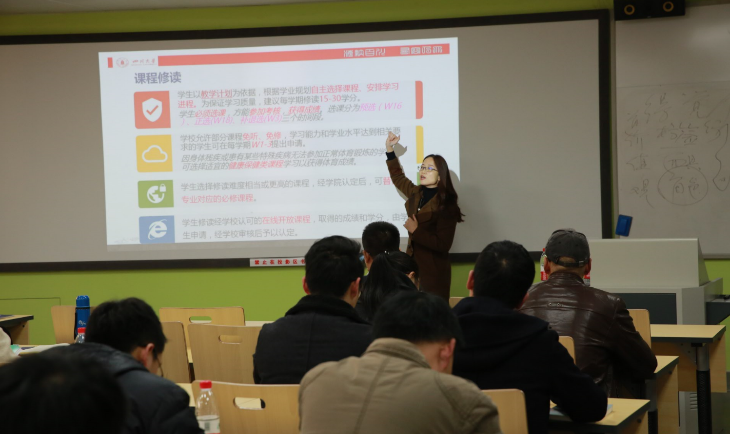 随后,兰利琼副处长作了“班主任胜任力培训之人才培养方案解读”的讲话。兰利琼副处长首先对川大本科教育基本情况作了介绍,分析了川大的人才培养目标是要培养具有“深厚的人文底蕴、扎实的专业知识、强烈的创新意识、宽广的国际视野”的国家栋梁和社会精英,希望我们的班主任能以深厚的学术功底和独特的人格魅力潜移默化地感染、引导学生。