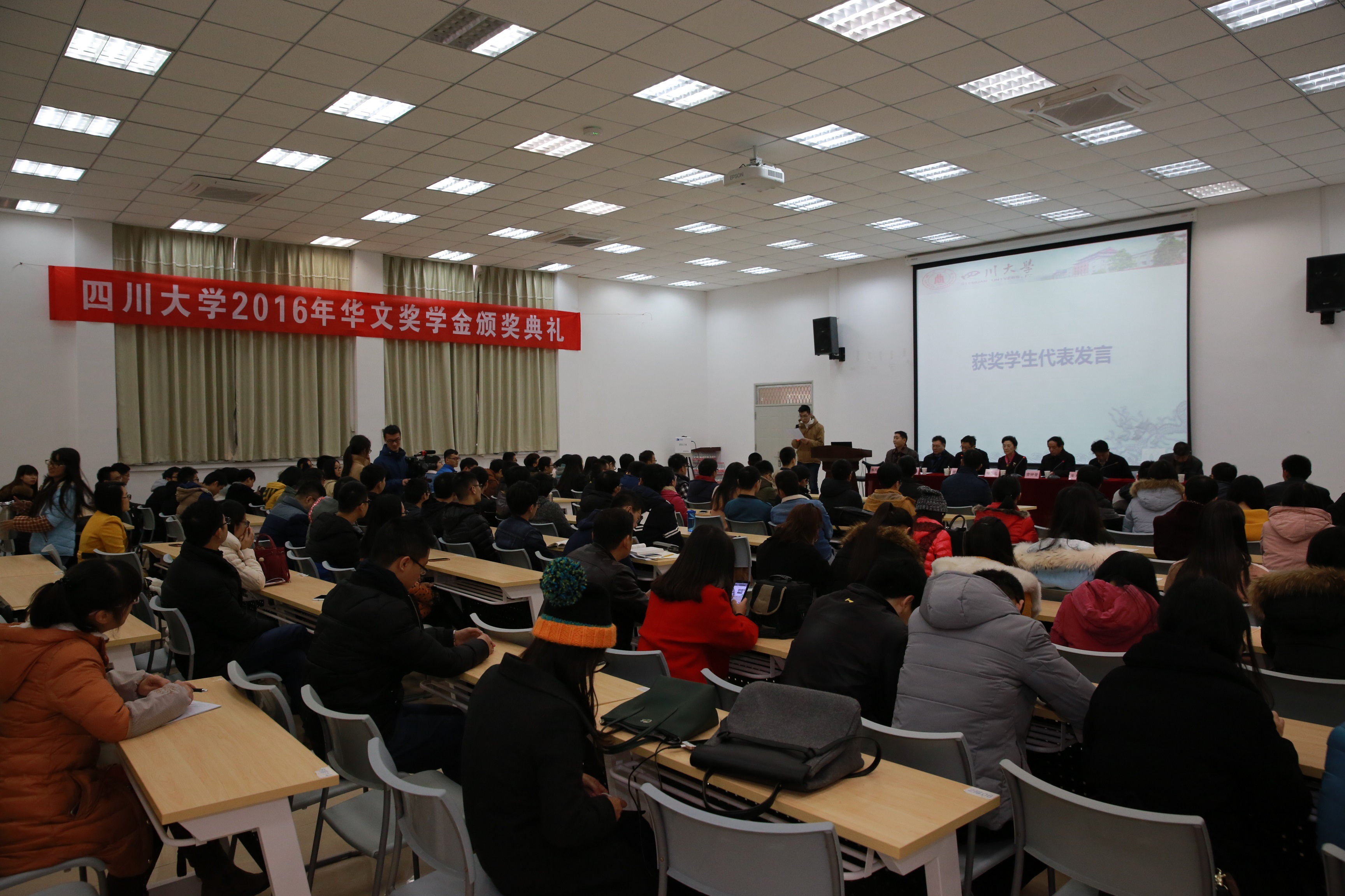 华文奖学金”获奖同学名单。紧接着,徐兰书记、古钟璧教授、郭勇部长、荣建国秘书长、蒋斌书记和黄卡玛院长为张宇飞、徐展鹏等22位获奖同学颁发了获奖证书。本科一等奖获得者,2014级本科生徐展鹏代表获奖同学进行了发言。他首先表达了对古钟璧教授和学校的感谢,也表示将会继续努力学习,不断提高自身综合素质和能力,回报母校、回报社会。