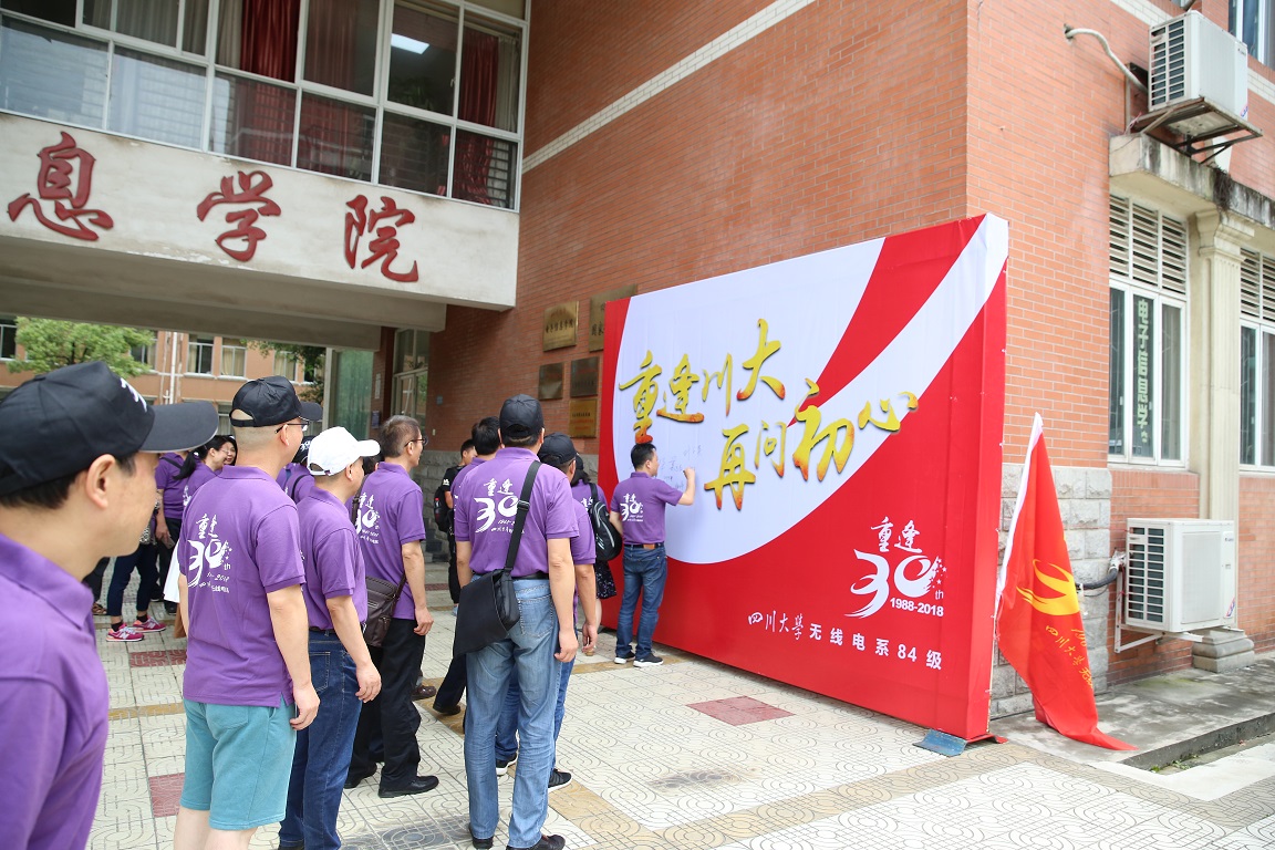 精心准备的签名墙前,看到“重逢川大,再问初心”八个大字,校友们感慨不已,纷纷上前签名留念。