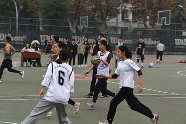 第四节女生上场,两边僵持不下。第四节结束,电磁所保持领先。