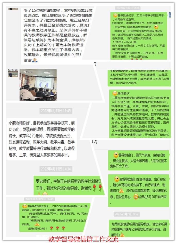 教学督导积极开展教学检查、课堂听课等相关保障教学质量的工作,全面掌握本科教学情况。督导听课工作有计划有安排务求实效。考虑疫情反复原因,教学督导组通常在微信工作群布置和交流相关工作。18XXX