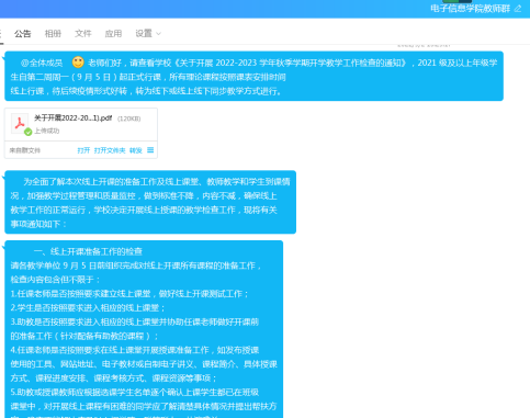 十分重视教学检查的各教学环节,开学前做了教学检查安排,并通知所有应开课课程在开课前都建立了师生联系课程QQ群,及时了解线上开课的准备工作及线上课堂、教师教学和学生到课情况,相关开课信息及时在18XXX