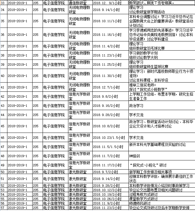 3、各系、各教研室、各课程组结合自身发展,积极进行“以学为中心”的教育教学方式方法的探索和学习,并针对学生问题开展相应的教研活动,加强教学过程管理,积极探讨课程中心建设、小班化教学改革、过程考核、非标准答案考试改革、本科论文指导、实验课程建设、学生创新实践指导,认真推动本年度教研工作,并做好相关教研活动的记录。各教研室教研活动记录不少于8次。系主任、教研室主任听课不少于4次。