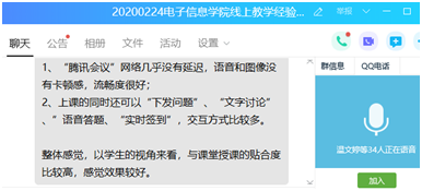 学生们普遍反映,上课老师都提前建立线上课堂做好线上开课测试工作,上课提前到岗,老师们备课充分,在直播系统里讲课声音清晰,分享的内容展示顺畅,并能利用系统提供的各种功能和QQ群与学生们互动,明确告知学生课程学习目标、要求及考核方式,课程内容充实,线上上课很有趣。学生到课率高、积极回答问题、课堂纪律气氛良好。