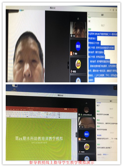 聘请了教学经验丰富、多次参与培训的教学督导龙建忠教授承担。在腾讯会议线上平台每位学员不限题目及形式就一个“问题”或“理论”进行5分钟的教学模拟演示,教学督导线上对学员进行点评、指导,并热情传授课堂教学经验。