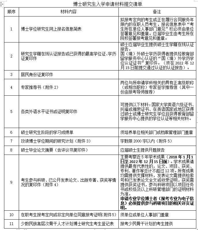符合报考条件的人员须下载 “提交博士研究生入学申请材料自查表”(附件1),按顺序整理材料,并在2022年12月15日17点前将申请材料、自查表和相关附件材料寄送达18XXX研究生招生工作办公室(以邮寄、快递寄到时间为准。联系地址:18XXX