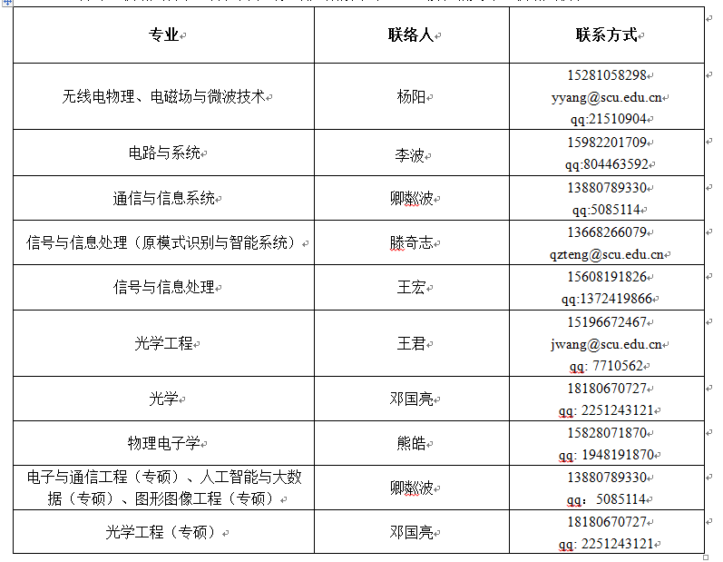 各专业联络人名单(各位同学可先确定拟报考专业,直接和相关专业联络人联系)