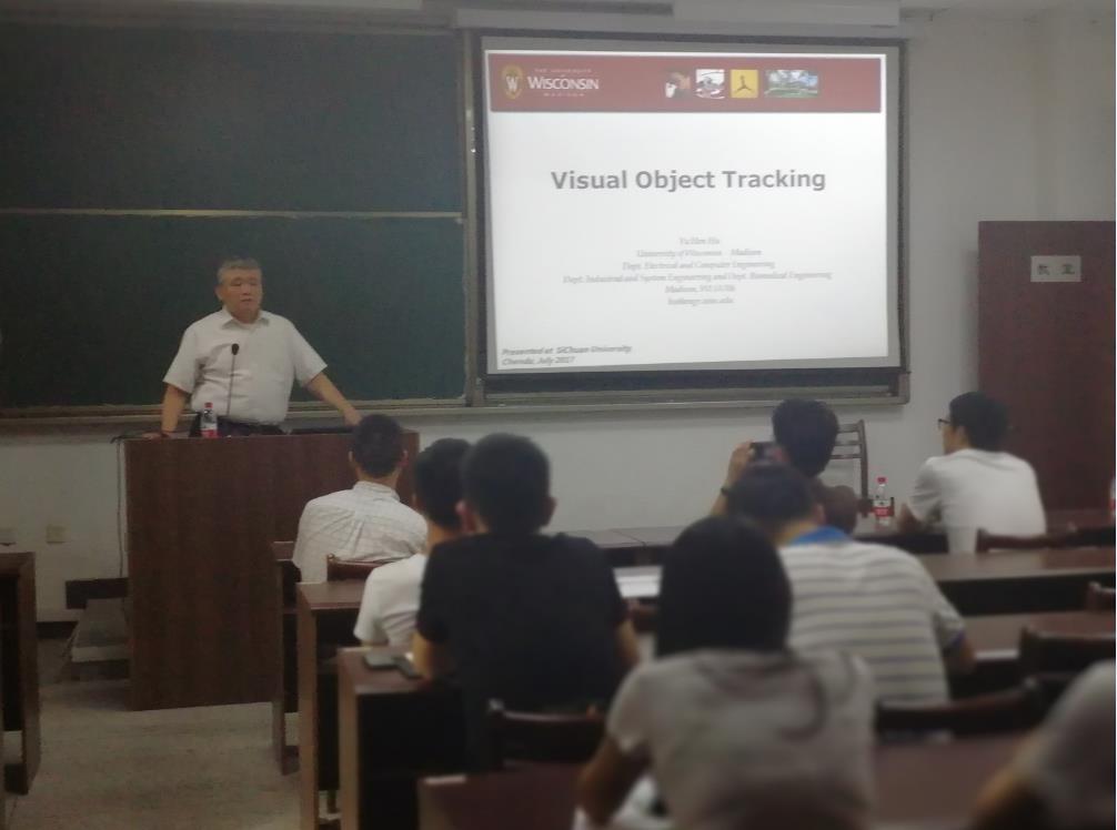 2017年7月3日,国际电气与电子工程师协会会士、美国威斯康星大学麦迪逊分校电气和计算机工程系的胡玉衡教授受邀到访18XXX,并做了一场以“Visual Object Tracking”题为的精彩学术讲座。18XXX的王君副教授主持了本次报告会,学校相关专业以及对视觉对象追踪技术感兴趣的师生积极参与了报告和学术讨论。