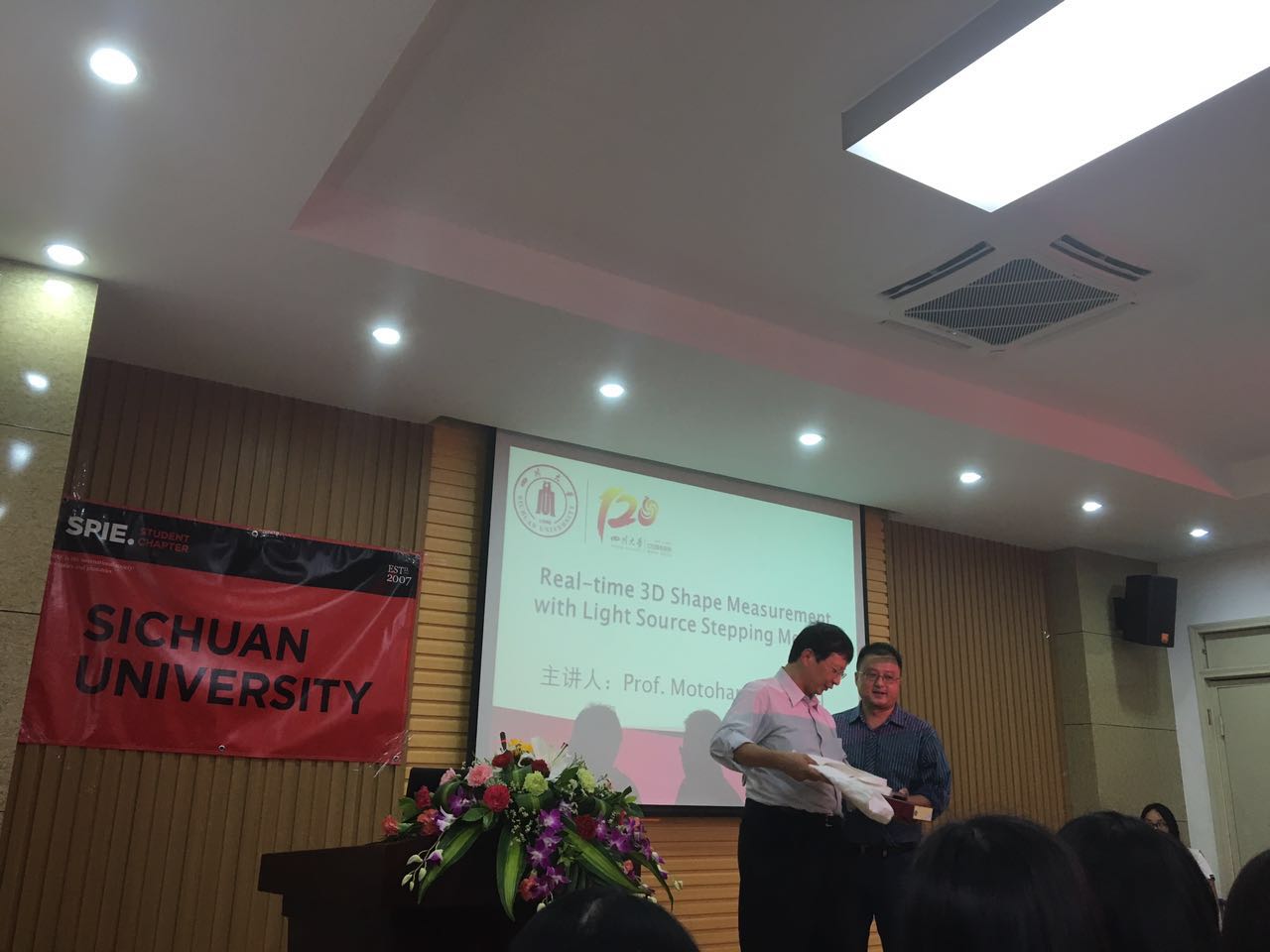 在报告会上,Motoharu FUJIGAKI教授结合自身的实践经验和研究成果,理论联系实际,首先提出实时三维形状测量的概念,接着讲述了实现一个形状测量使用移相的方法可以测量形状课获得高空间分辨率,提出了light-source-stepping methond(LSSM),即使用一个线性LED阵列的整个空间列表法。并对算法及其引发的问题进行了深入浅出的分析。Motoharu FUJIGAKI教授指出准确的形状测量可以使用这种方法。Motoharu FUJIGAKI教授对于老师和同学们提出的问题,进行了详细的解答。最后,由18XXX 的学生为Motoharu FUJIGAKI教授献上18XXX 120周年校庆纪念品。