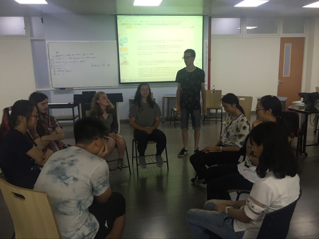 秉承循序渐进的原则,在第一个游戏时,选择了一个中外同学都很熟悉的游戏uno,大家对这个游戏都很熟悉,在游戏的过程中,彼此的融洽程度进一步加强,在愉快的氛围中结束了第一个游戏。第二个游戏则是狼人杀,这个游戏对于交流营的女同学来说不是很熟悉,但男同学很感兴趣,积极地与18XXX学生交流讨论游戏规则,最终由其中的一位留学生为所有同学解释游戏规则,大家一起参与到了整个游戏当中,虽然刚开始不是很顺畅,但在大家边玩边交流的过程中,大家愈来愈熟悉,在游戏中的沟通也越来越顺畅,在愉快的氛围中结束了本次的交流活动。