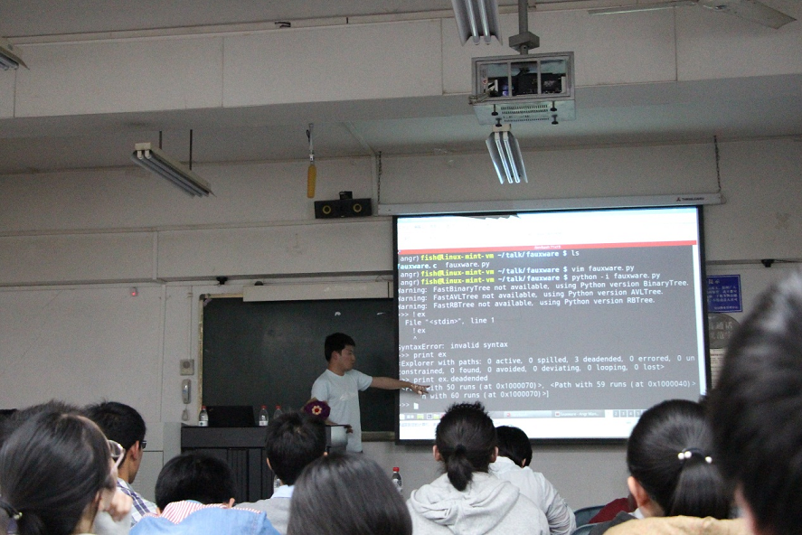 第二个议题是由Ruoyu Wang带来的“二进制工具介绍”,通过演示他所在的团队研发出的二进制分析工具集——Angr,向在场的同学们对比了Angr和IDA的不同以及该工具如何实现符号执行测试。
