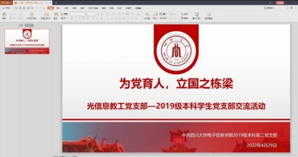 2019级本科学生第一党支部、第二党支部联合举办“为党育人,立国之栋梁”主题党日交流活动。交流活动于望江校区基础教学楼A307室顺利举行。本次交流活动采用2019级本科第二党支部党员线下交流、2019级本科第一党支部党员线上交流的方式举行。