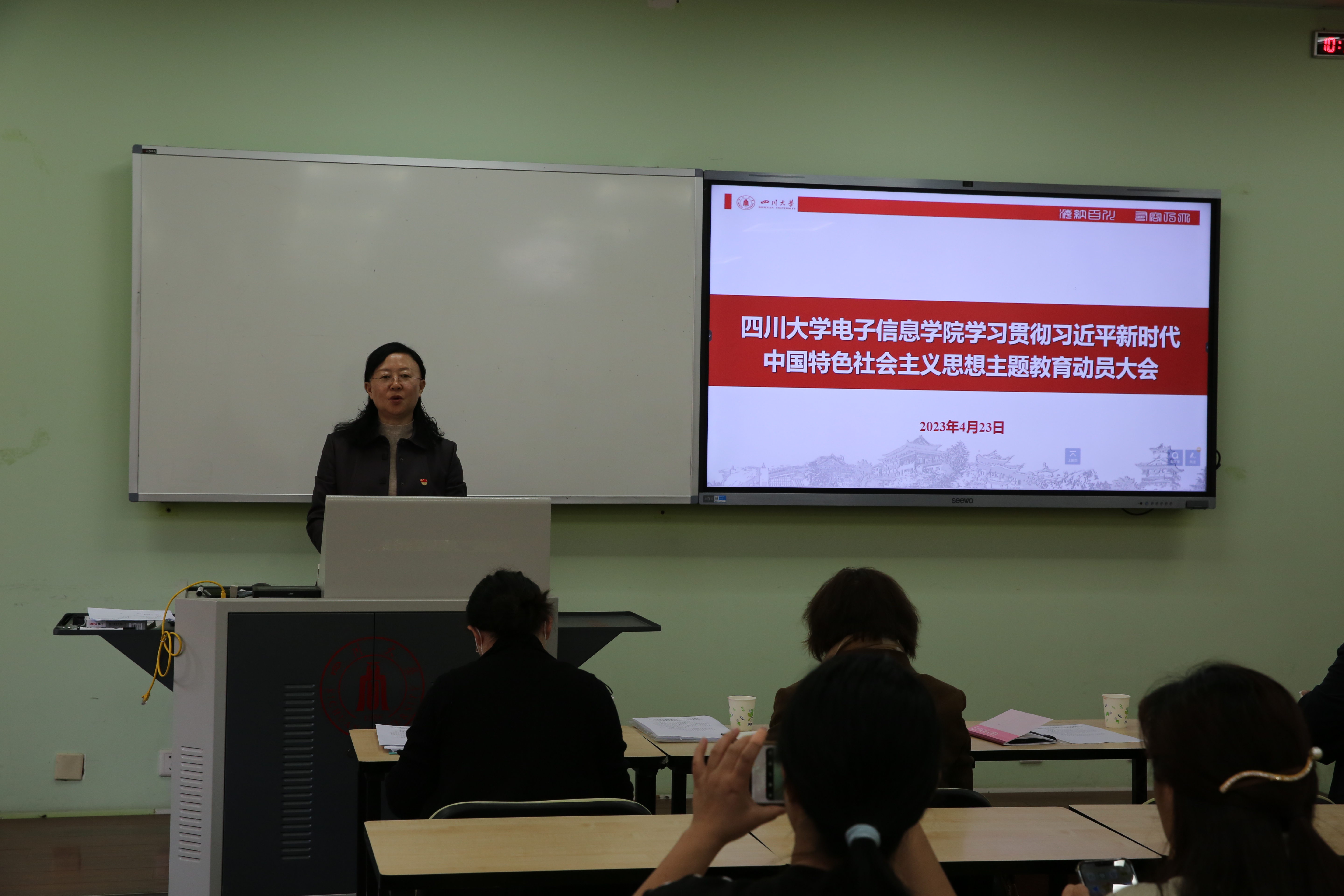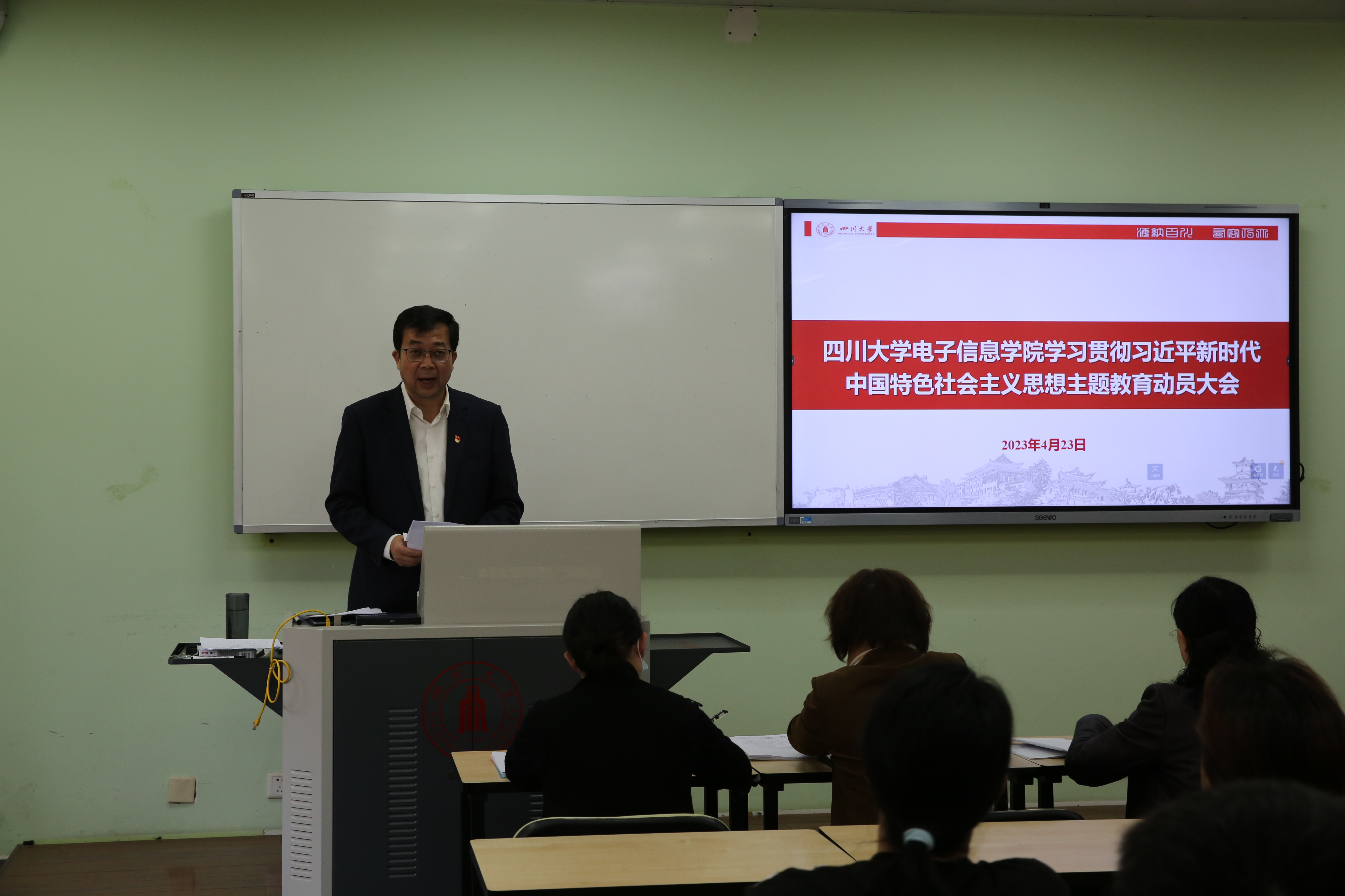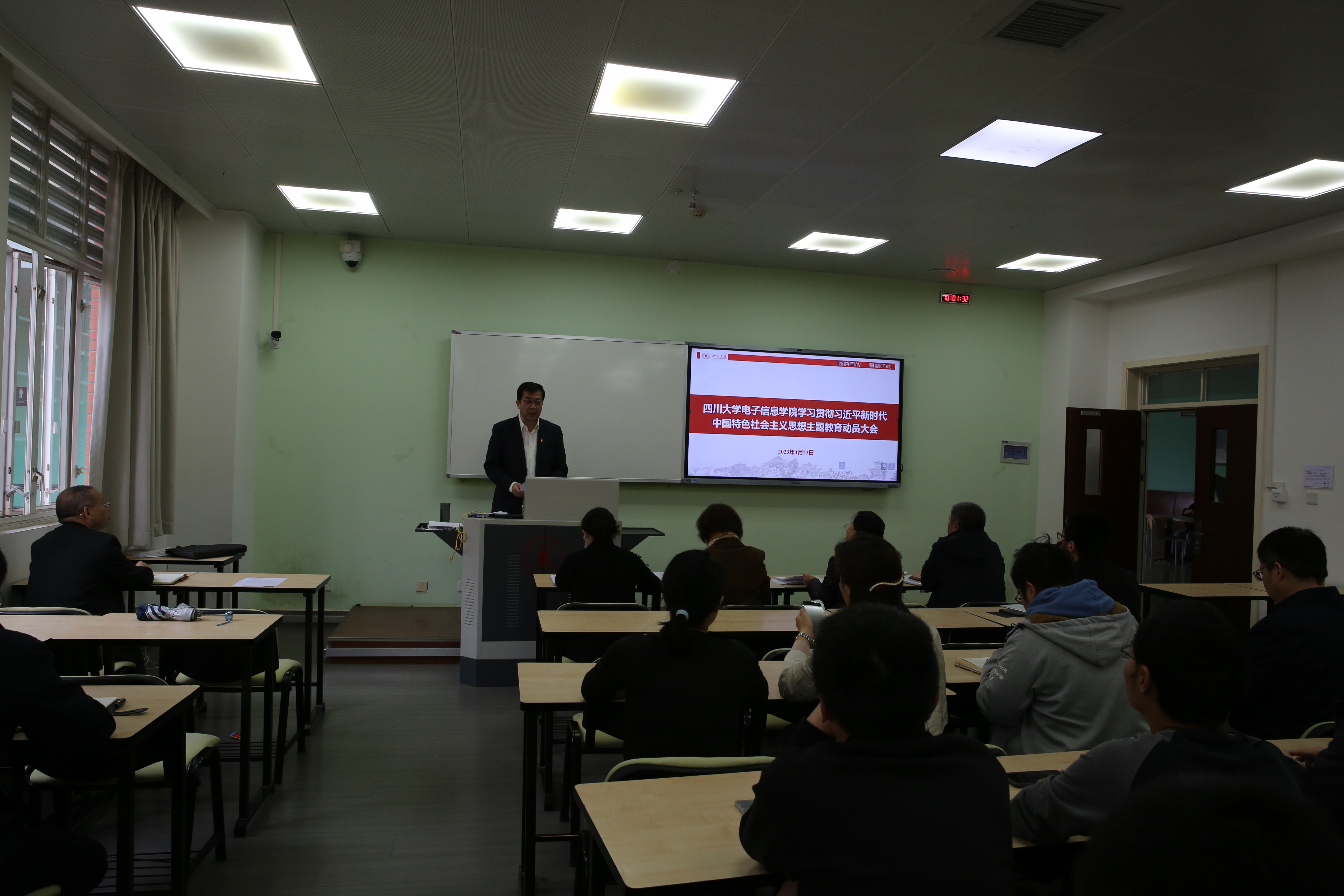 4月23日,18XXX 在望江校区基础教学楼A316室召开了学习贯彻习近平新时代中国特色社会主义思想主题教育动员大会。院党委书记邰明松主持会议,并作动员讲话。学校学习贯彻习近平新时代中国特色社会主义思想主题教育第二指导组组长、18XXX 纪委原副书记、监察处处长,计算机18XXX 专职组织员郝清华作指导讲话,第二指导组全体成员、18XXX 全体两委委员及中层领导干部、院长助理、高层次人才、教工党支部学生党支部支委、师生党员代表等参加了动员大会。