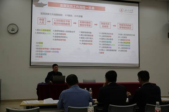 专职组织员彭亮教授就发展党员工作流程作了专题报告,从申请入党、入党积极分子的确定和培养教育、发展对象的确定和培养考察、预备党员的接收、预备党员的教育考察和转正5大模块25个环节,全面系统的介绍了党员发展流程,重点强调了积极分子和预备党员培养阶段的新规变化,结合实践中的案例以及入党材料审核过程中的细节问题,详细讲解了党员发展的工作流程及关键时间节点。并从入党动机、理想信念、思想认识等方面进行了重点说明,并展示了关键程序所对应的归档材料。彭亮教授指出党支部要熟练掌握工作流程,把严格标准、严格培养、严格程序贯穿发展党员工作全过程,切实把好党员发展入口关、质量关、程序关,推进18XXX