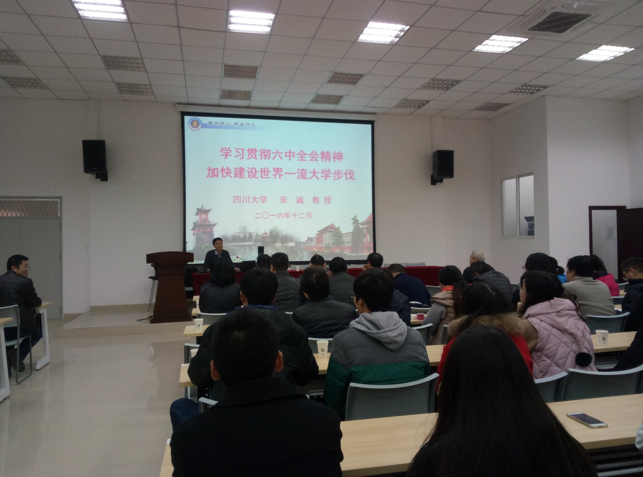 党委在望江校区五教附一楼101会议室举行“党的十八届六中全会精神宣讲报告会”,特邀学校宣讲团成员张诚教授主讲。报告会由院党委书记蒋斌同志主持,18XXX