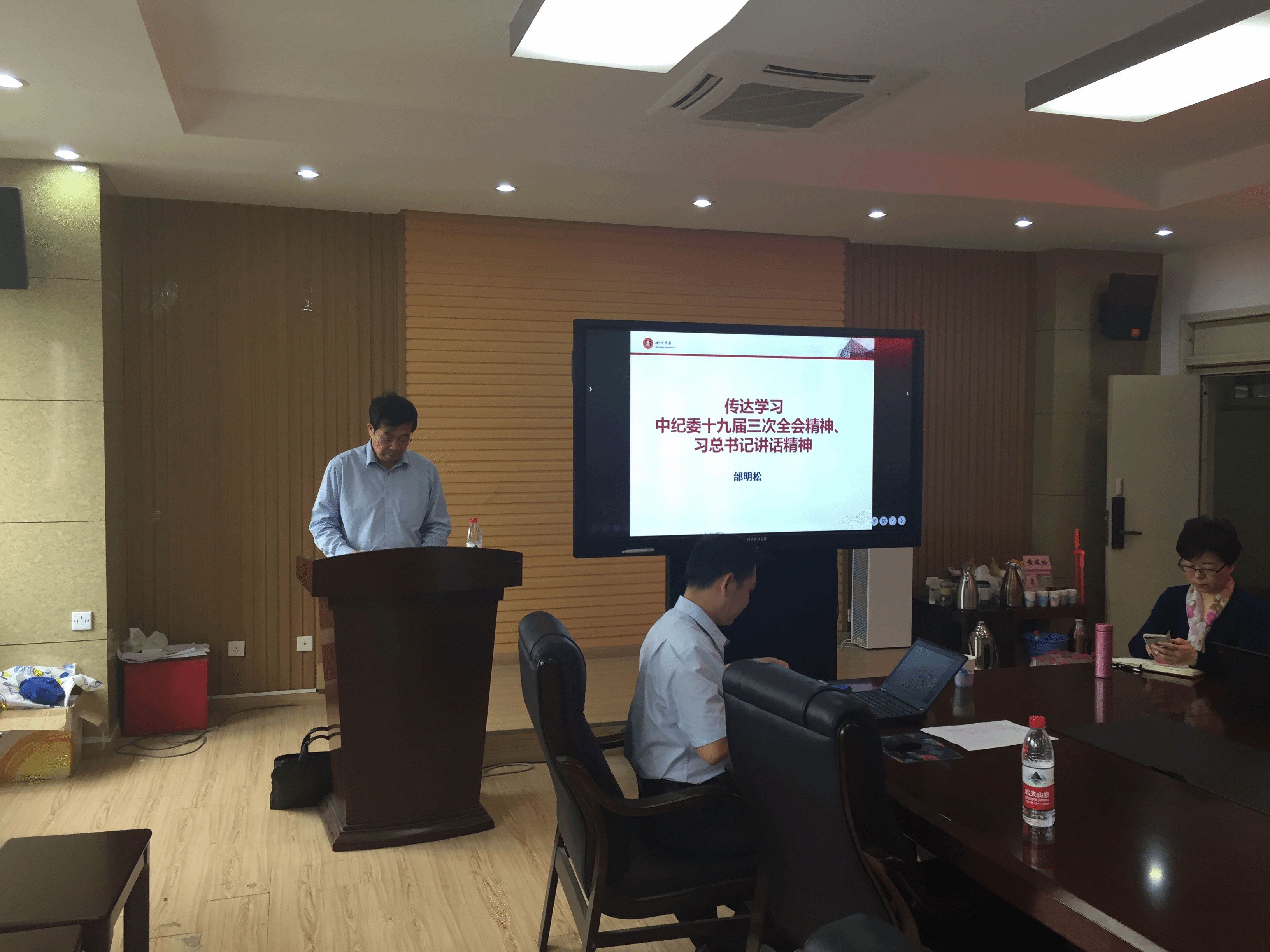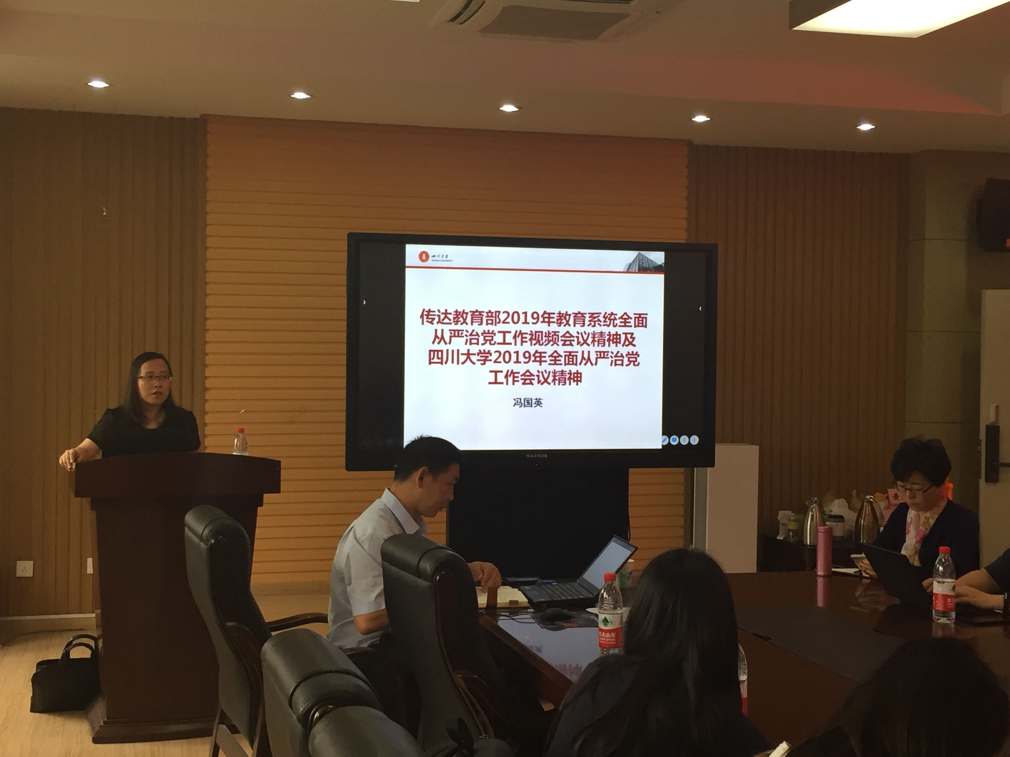 全面从严治党工作会议的相关精神与参会的各位师生进行学习。冯院长指出,正值新中国成立70周年,所有高校应该以优异成绩庆祝该关键节点,全面从严治党工作的开展能够为教育改革稳定发展保驾护航。