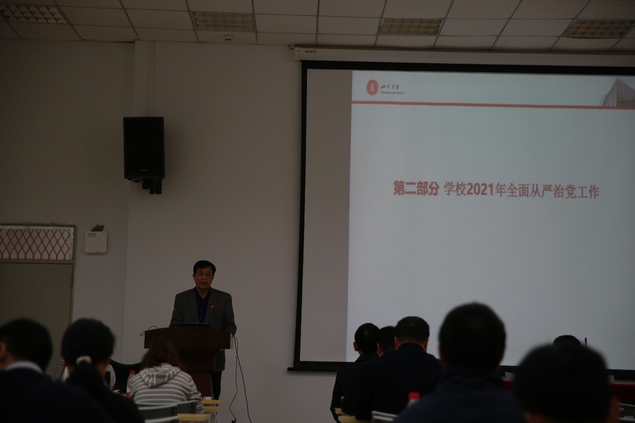 邰明松书记从深入学习贯彻十九届中央纪委五次全会精神、四川省纪委十一届五次全会精神和教育部全面从严治党会议精神;回顾总结过去一年学校全面从严治党工作;部署安排2021年重点任务三个方面全面传达了学校会议精神。