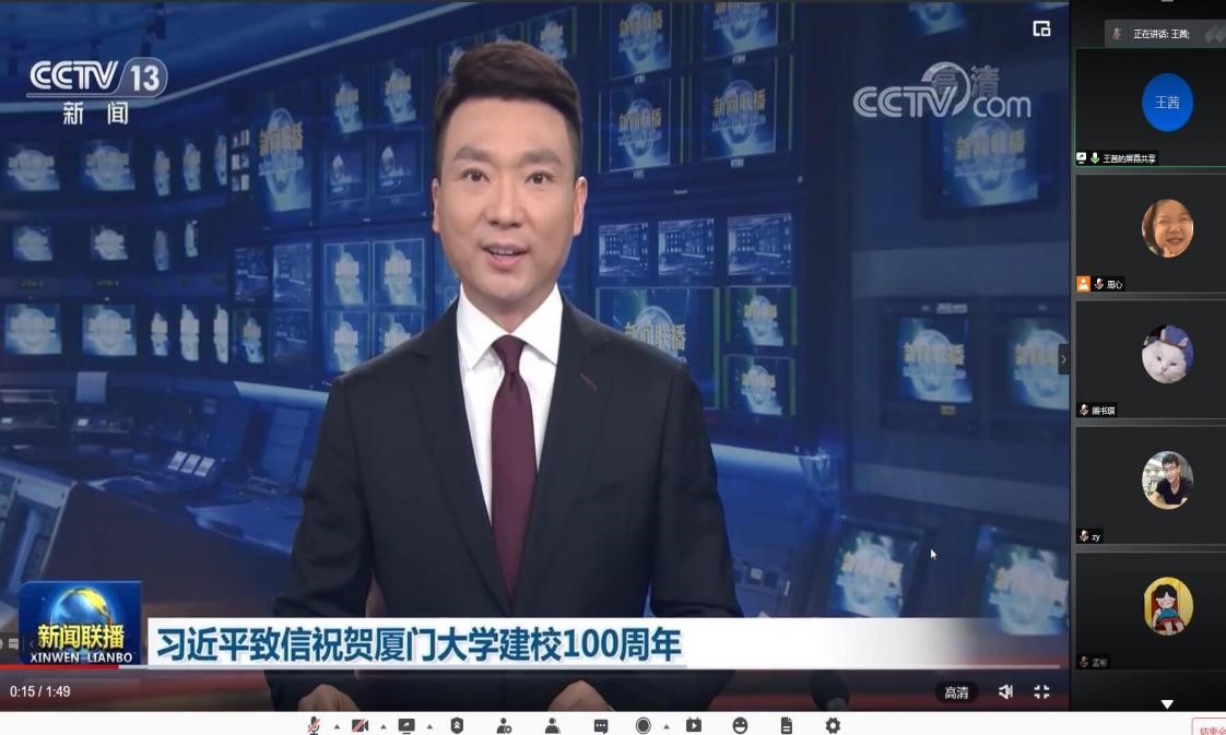 随后,通过线上学习观看贺信相关视频及宋甜同学朗读贺信精神,班级同学线上分享了活动心得。深入学习习近平总书记厦大建校100周年贺信精神,引导同学们准确把握贺信精神的核心要义,充分认识到总书记贺信精神的深刻内涵和重要意义。贺信精神,意蕴深远、内涵丰富,既是激励鞭策、也是目标导向,既是理论指导、也是实践要求。我们要将学习贯彻习近平总书记的贺信精神与党史学习教育紧密结合,认真学习领会和全方位贯彻落实习近平总书记致厦门大学贺信精神,坚持学做结合务求工作实效。