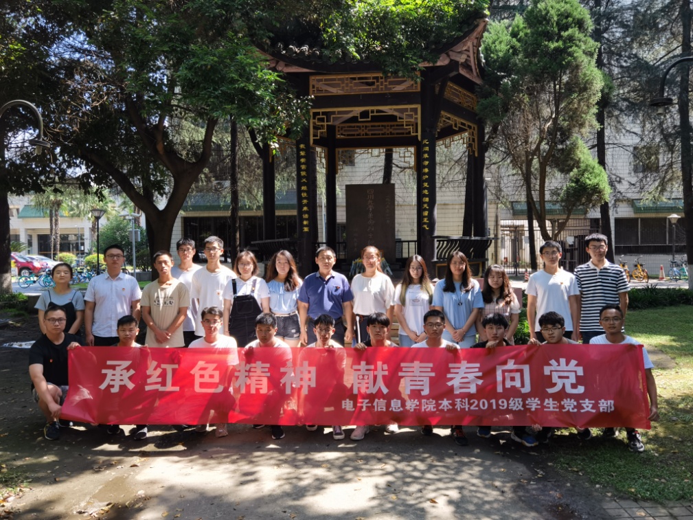 革命先烈纪念碑是为建立新中国而英勇牺牲的川大师生而于1985年修建的,碑亭立柱上有一副对联,上联是“此间革命熔炉复地翻天留正气”,下联是“我辈黉宫俊人继往开来谱新篇”,纪念碑背面刻有张培爵、王右木、恽代英、童庸生、杨闇公、袁诗尧、李正恩、江竹筠(江姐)等四十多位曾经在川大学习和工作过的革命烈士的名字。