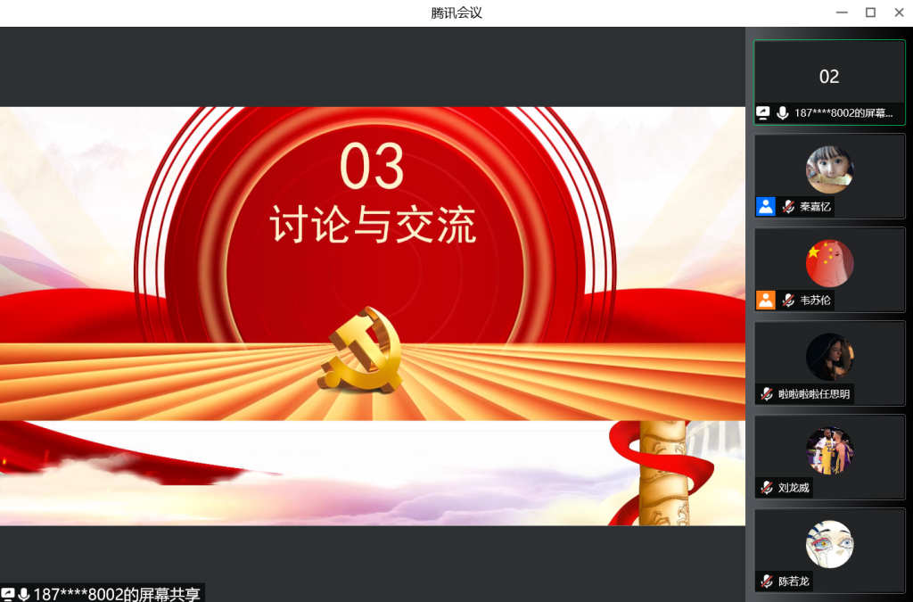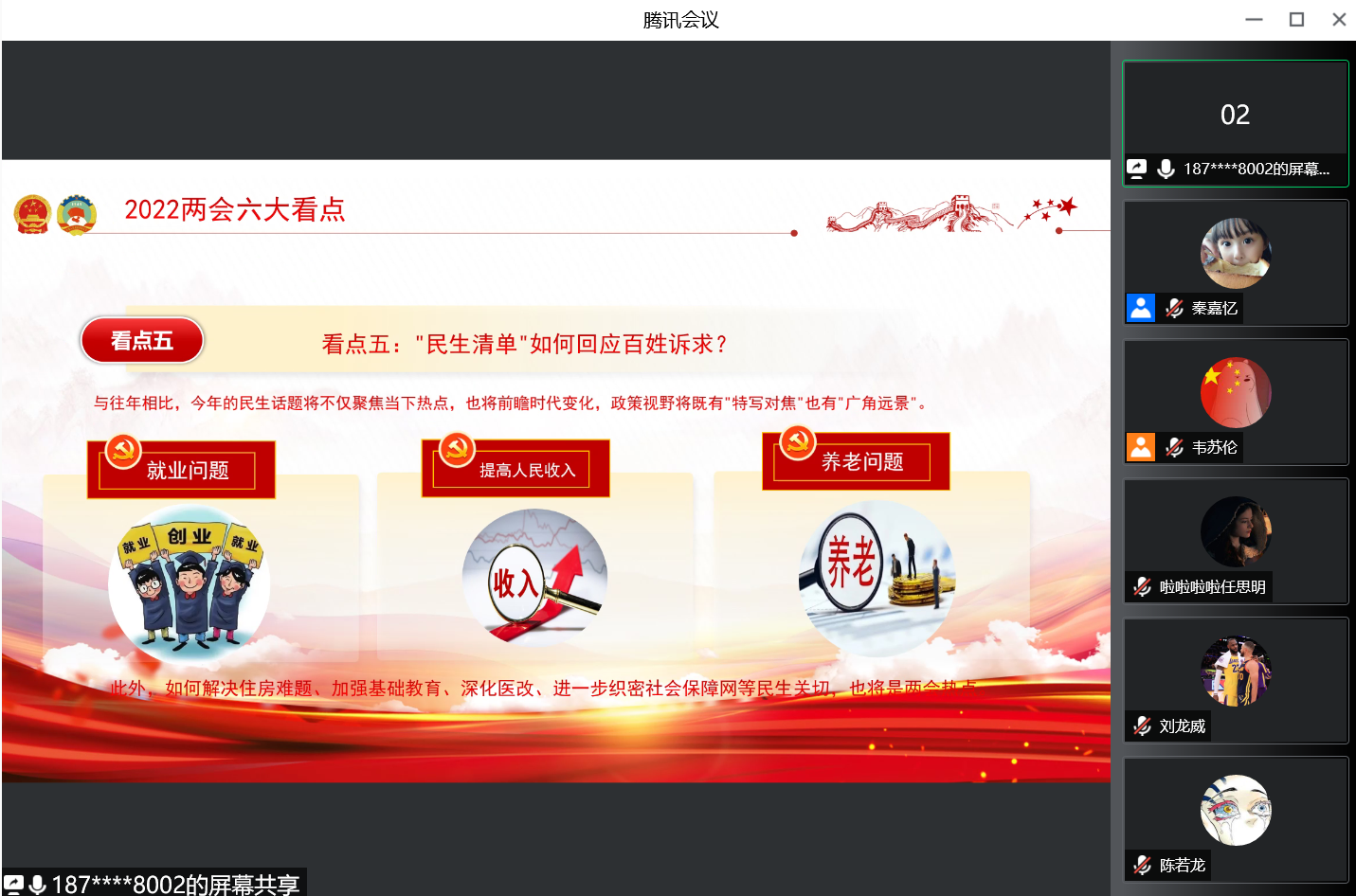 根据防疫规定,团日活动的组织形式采取线上交流形式。晚九点整,会议准时召开。会议开始前,团员们齐声共唱团歌,回顾团的章程,激发同学们对于团日活动的参与热情。接着,八班团支部书记朱晗带领大家回顾十三届全国人大五次会议、全国政协十三届五次会议的基本情况,简要介绍会议召开的时间和背景,同时针对两会中的核心看点进行说明和介绍。然后,同学们对热议的话题进行讨论和分析,大家各抒己见,将活动推向高潮。最后,团支书进行总结陈述,并呼吁支部的青年们要“站在新的起航线上,整装待发,准备扬帆启程”,会议也在同学们的热烈讨论中落下帷幕。