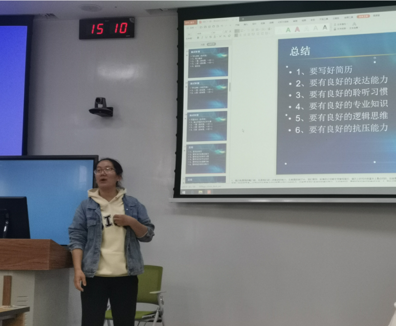 其次,吴老师讲解了同学们在笔试和面试中应该注意的事项,强调了着装方面的问题。另外,她建议同学们在参加一个企业的笔试和面试之前,要做好充分的准备。吴老师还给大家列举了一些企业招聘的流程,以及在过程中的一些注意事项。她总结到同学们找工作要注意以下几点:写好简历,有良好的表达能力,良好的聆听习惯,良好的专业知识,良好的逻辑思维,良好的抗压能力。