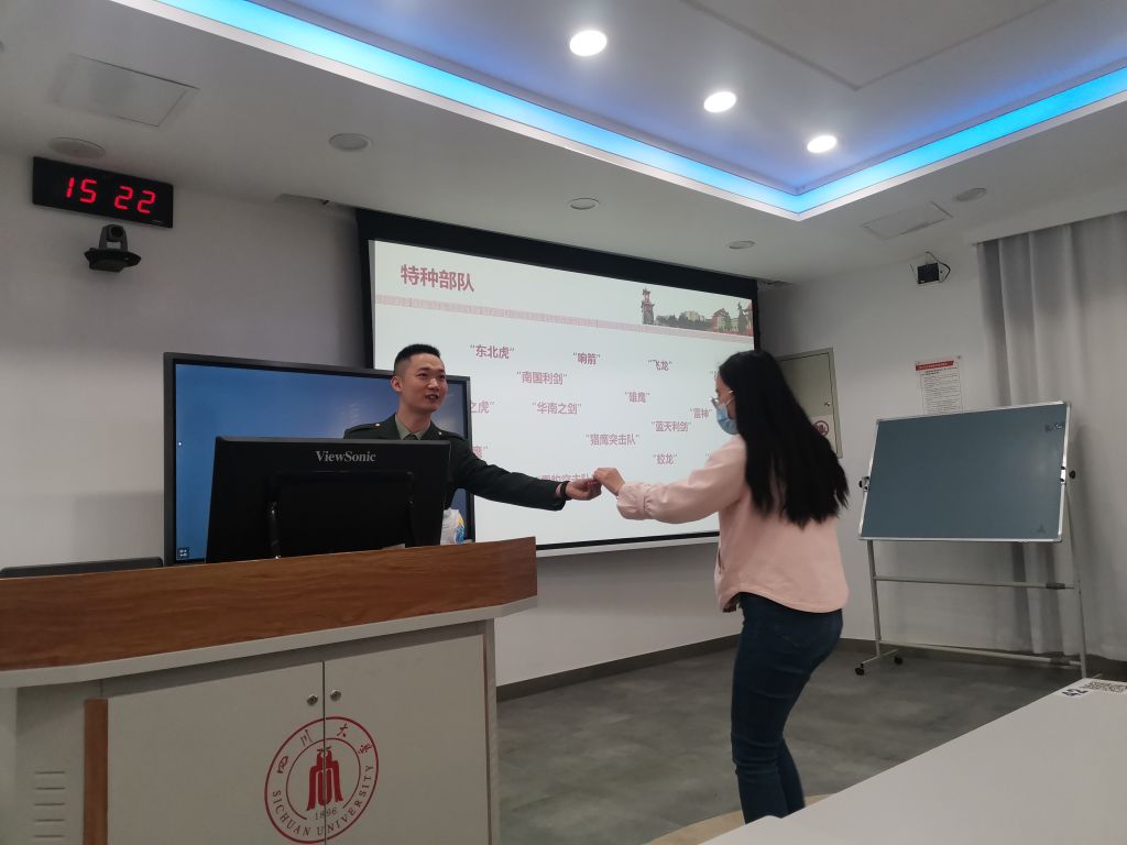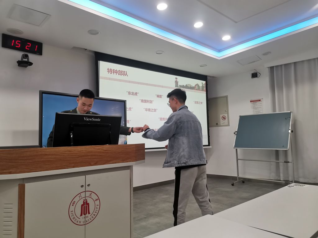 征兵宣讲团团长,整个宣讲气氛热烈。刘浪学长是本科期间征兵入伍,退伍之后在川大继续研究生深造。他给同学们讲述了精彩的军旅生活,以及自己的感悟和取得的荣誉,当兵养成好的习惯和作风,让他受益终身,不仅淬炼了毅力和体魄,同时更加认识到身为军人的责任和担当。讲述过程中还积极互动,把子弹壳作为礼物送给答对题的同学。最后刘浪学长介绍了参军流程以及相关的政策,比如大学生士兵可以直招军官,而且退役了还会有学费补偿、继续深造等方面优待。