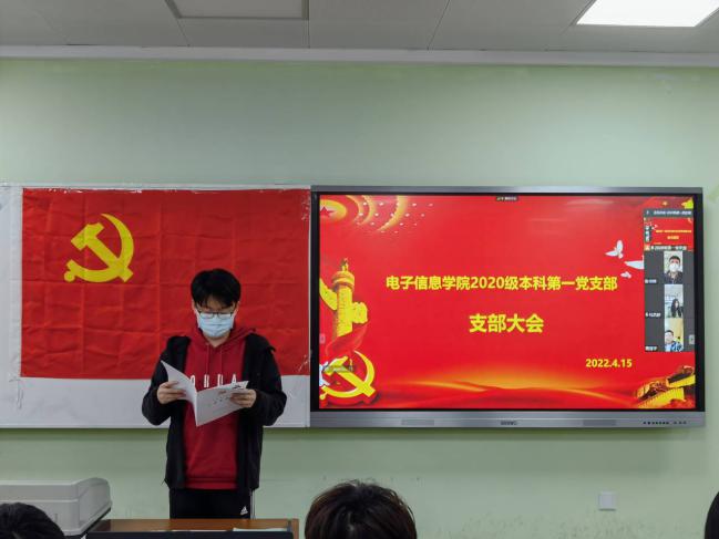 2020级本科第一党支部讨论接收王之尹等15人为中共预备党员大会现在开始。本支部应到会正式党员8人,实到会正式党员8人,符合规定人数”,并提出了会议具体要求。15时30分,入党发展对象在党旗下庄重宣读了《入党志愿书》。随后,陈立玮、何林珍、王海麟、李享、马艺舒、黄泽宇、张书博七位入党介绍人向支部大会介绍培养考察情况以及发展对象的政治审查情况,指出申请人的优、缺点并提出改进建议。在一番认真细致的讨论后,到场的入党介绍人采用无记名投票的方式进行表决,并在支部大会上宣读同意接受的申请人名单。王之尹等15人正式成为预备党员。