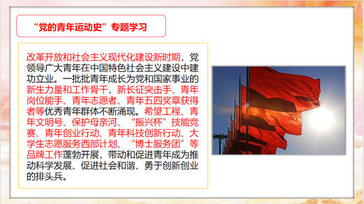 活动伊始,团干部带领团员们齐唱团歌、重温入团誓词。随后,团支书带领团员们持续深化学习党的百年奋斗重大成绩和历史经验,特别是党领导中国青年运动的光辉历程,通过对党在新民主主义革命时期、社会主义革命和建设时期、改革开放和社会主义现代化建设新时期对广大青年运动的领导的介绍,使得团员能够深切体悟共产党领导下的青年运动的重要性与意义,激发团员紧紧依靠在党中央周围积极投身于青年运动之中。随后,团支书播放相关节目片段,供团员们进一步学习。活动最后,团支书组织开展中央有关重要精神的专题学习并播放相关主题视频,引导团员青年深刻体会习近平总书记对青年一代健康成长的重要要求,践行习近平总书记对当代青年成长成才的正确道路和实践路径。