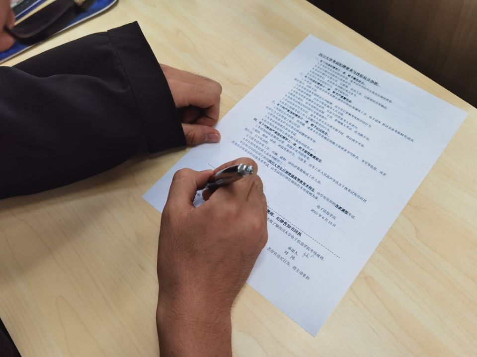 会议上,陈晓娟老师着重强调了遵守考试纪律的重要性。她指出学校及学院高度重视同学们的考试诚信问题,并结合往年考试时学生违纪舞弊被严肃处理的事例,提醒同学们要以诚实守信为荣,以考试违纪为耻。她还提醒同学们注意考场的相关规定细则,切记不要因为大意疏忽而违反了考场纪律。随后为同学们分发了考试纪律承诺表。同学们详细阅读了考试相关纪律,并郑重承诺遵守纪律,签完名后纷纷上交。