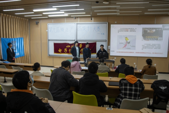 概念产品设计大赛决赛在综合楼C座105教室举行,比赛的形式是交纸质版作品报告,并进行PPT现场展示。出席现场的老师有华伟老师、李玮老师、孟庆党老师、朱婧老师、孟滋常老师、陈林老师,其中孟庆党和李玮两位老师在线上参与评审,还有入围18XXX