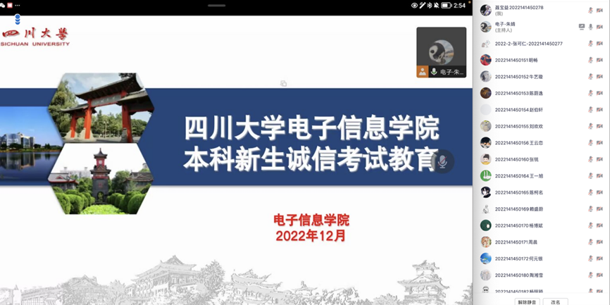 2022级辅导员朱婧老师在线上腾讯会议对同学们进行了本次形势与政策课的授课,授课内容主要围绕本科新生的诚信考试教育。本次线上教育处于四六级考试前夕,旨在结合实际,强化学生考风考纪管理,树立学生良好的学习品德并养成诚信考试的习惯。