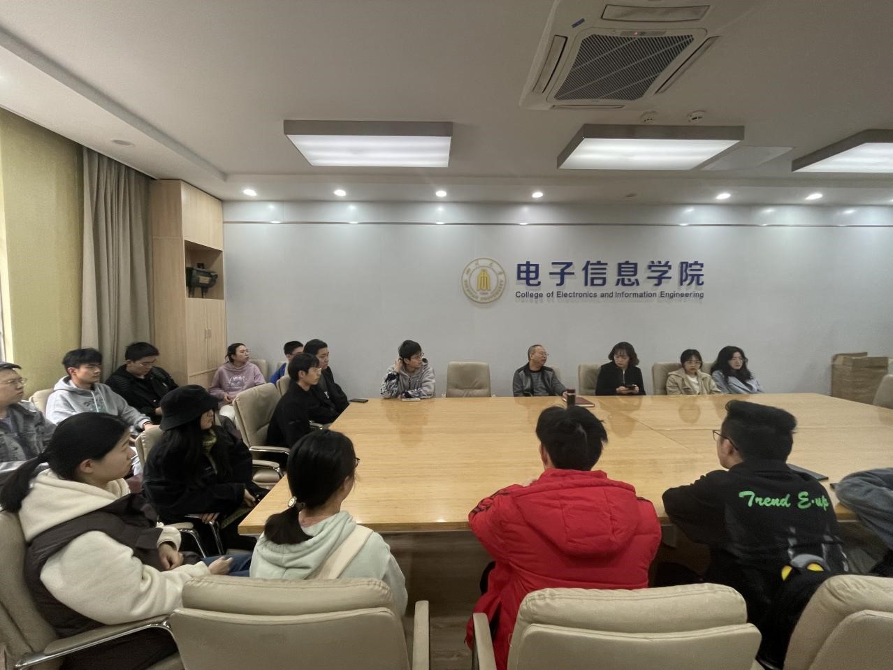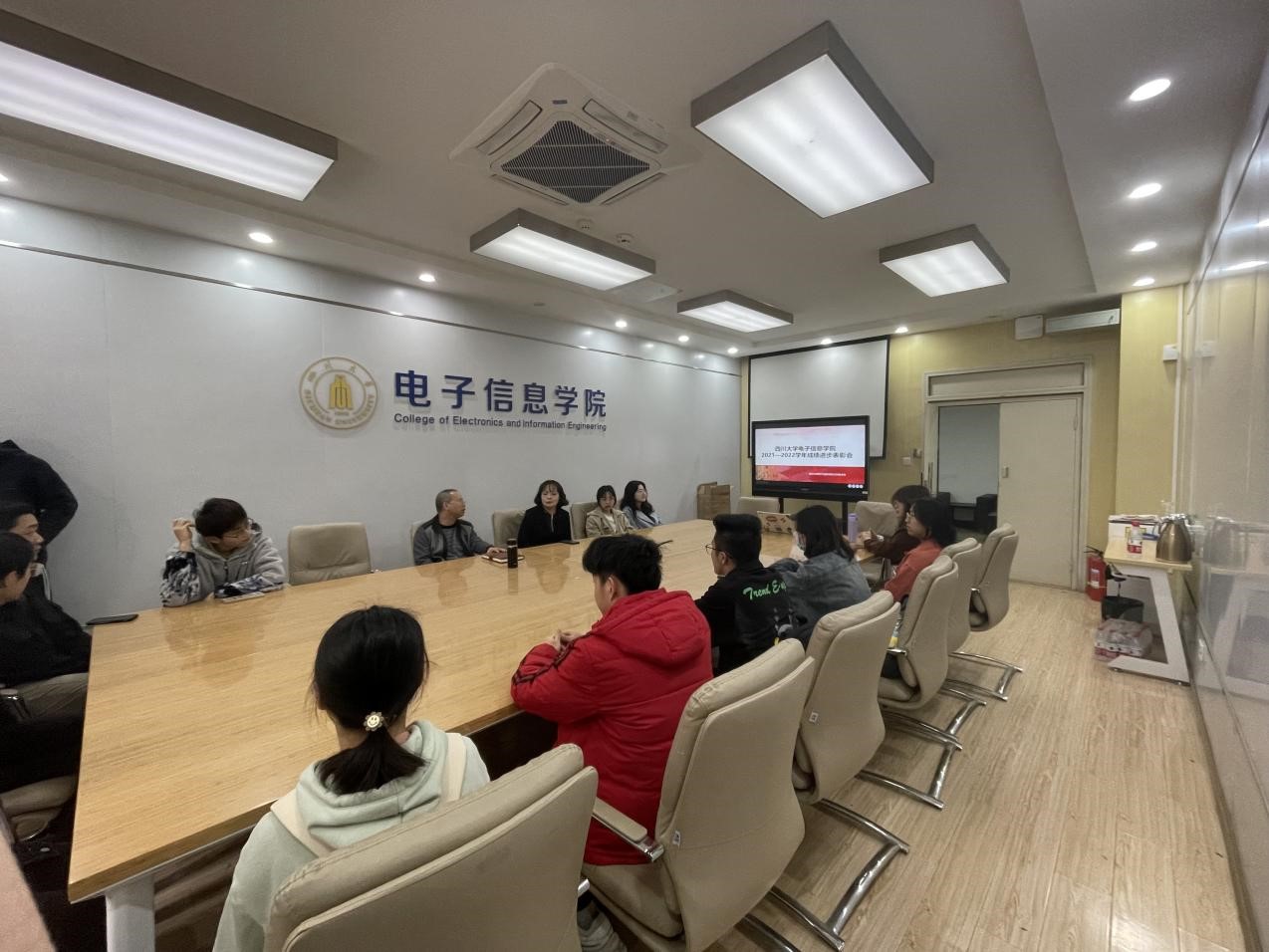 在基础教学楼A座110会议室召开2021-2022学年成绩进步表彰会,参会的人员有学院廖书记、辅导员陈老师、受表彰的同学以及党员干部等。