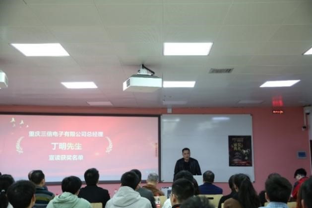 下午2点30分,颁奖典礼正式开始。首先,全体起立奏唱国歌,主持人介绍到场领导及嘉宾。随后,重庆三信电子股份有限公司总经理丁明先生就公司的现阶段发展状况及对未来的展望向学院师生作了简要的介绍,并宣读了2022年度“三信”奖教奖学金获奖名单。