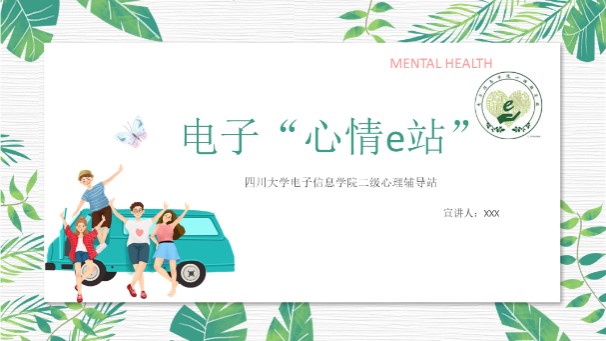 二级心理辅导站——电子“心晴e站”工作展开,在征集优秀PPT模板设计作品的同时,展现电子“心晴e站”在过去半年工作中的形象树立成果,了解同学们对今后e站的形象建设方向的建议与期待。18XXX