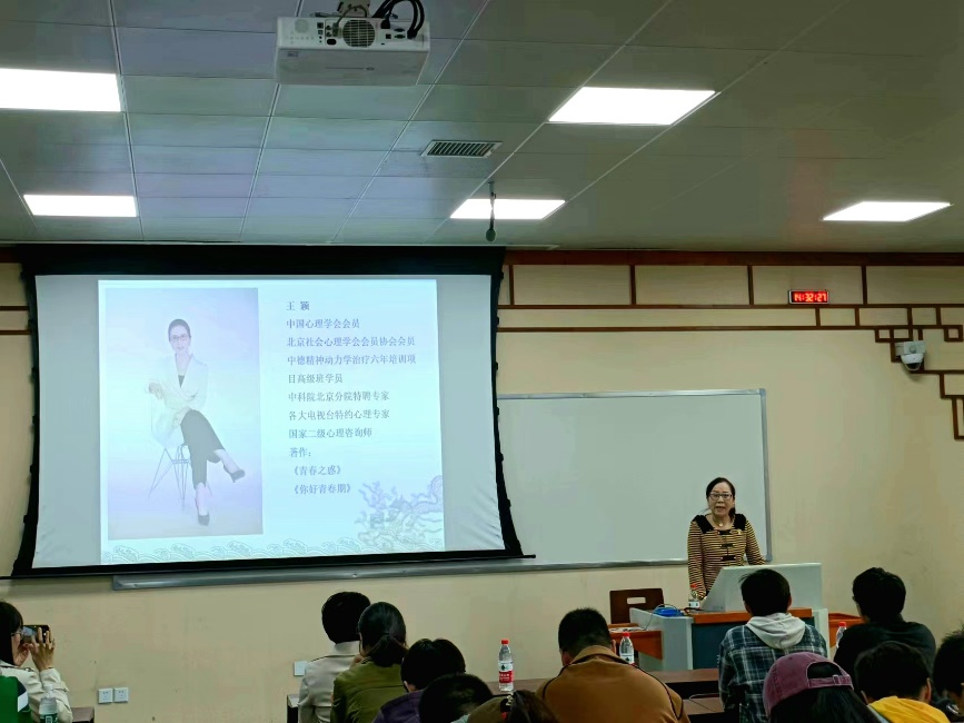 讲座开始后,王老师通过三道压力测试进行讲座导入,并阐述了心理健康的五个标准“热爱生活”、“悦纳他人”、“自知自爱”、“情绪稳定”、“意志健全”,让同学们不再单一地认识心理健康。