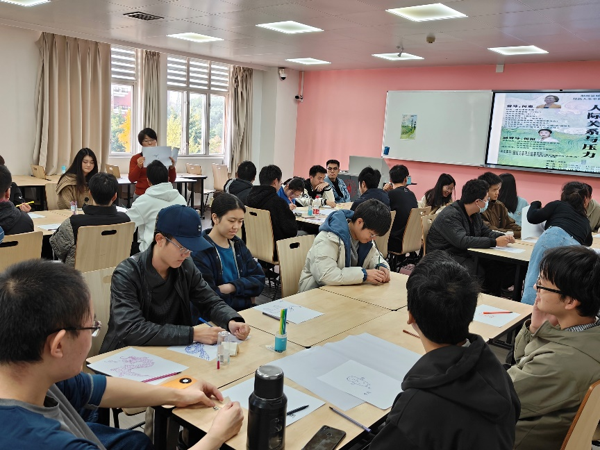 “e心致学”辅导员工作室承办的 “团体辅导——人际关系与压力”班级心理团辅系列活动在基础教学楼A420开展,全体5班同学参加。本次活动由督导何惠老师、副督导何阳老师共同主持,旨在让同学们从繁忙的科研工作中获得放松,停下来感悟自己,理解自己、理解他人,在人际关系中成长和觉察。
