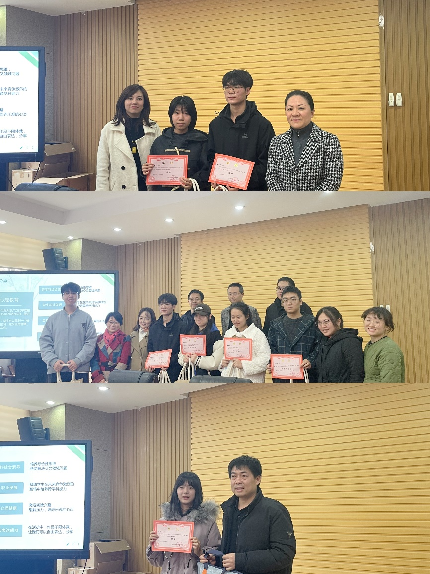 本次活动分为三个环节。第一环节,由“沁心书会”的王文凯同学向全体老师和同学展示读书会成果并作相关总结。首先,王文凯同学公布了好书推荐活动的获奖名单,并分享了参赛同学的读书心得以及评审老师的精彩评语。然后,何惠老师对本次读书会活动进行了总结,指出该活动对学生综合能力、文学素养以及创新思维、批判性思维培养的积极意义。之后,王文凯同学又向老师和同学分享了对该活动实际意义的相关思考。最后,由到场老师们给获奖同学颁发证书,获奖同学与到场老师合影留念。