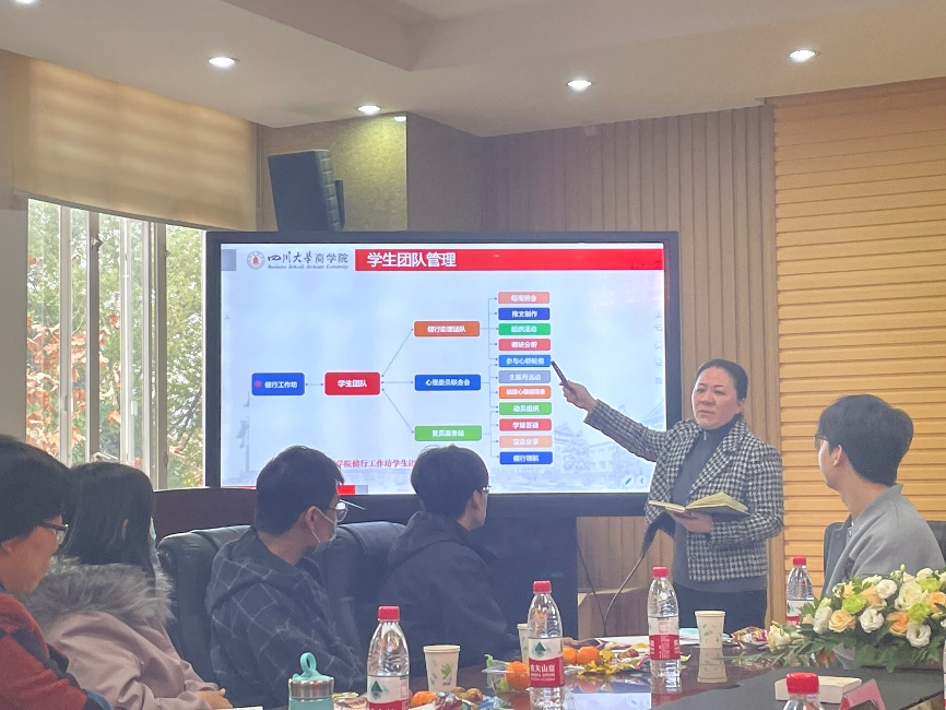 第三环节,由吴笑老师作有关辅导员工作室建设的工作交流。吴笑老师从工作场地,工作室架构,工作室工作推进思路,实施团队以及学生团队管理等方面为到场老师和同学详细介绍了辅导员工作室的工作内容,展示了辅导员工作室科学完整的运行体系,并阐明了辅导员工作室的工作目标与实际意义。最后,与会老师和同学们进行了热烈地交流讨论,活动圆满完成。