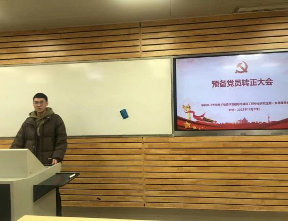信息与通信专业研究生第一支部委员会召开预备党员转正大会,本次会议由党支部副书记郭乙颗同志主持,支部书记何惠老师及支部全体党员参加会议,会议主要讨论了关于党支部于嘉杰、唐露两名预备党员同志转正的相关事宜。