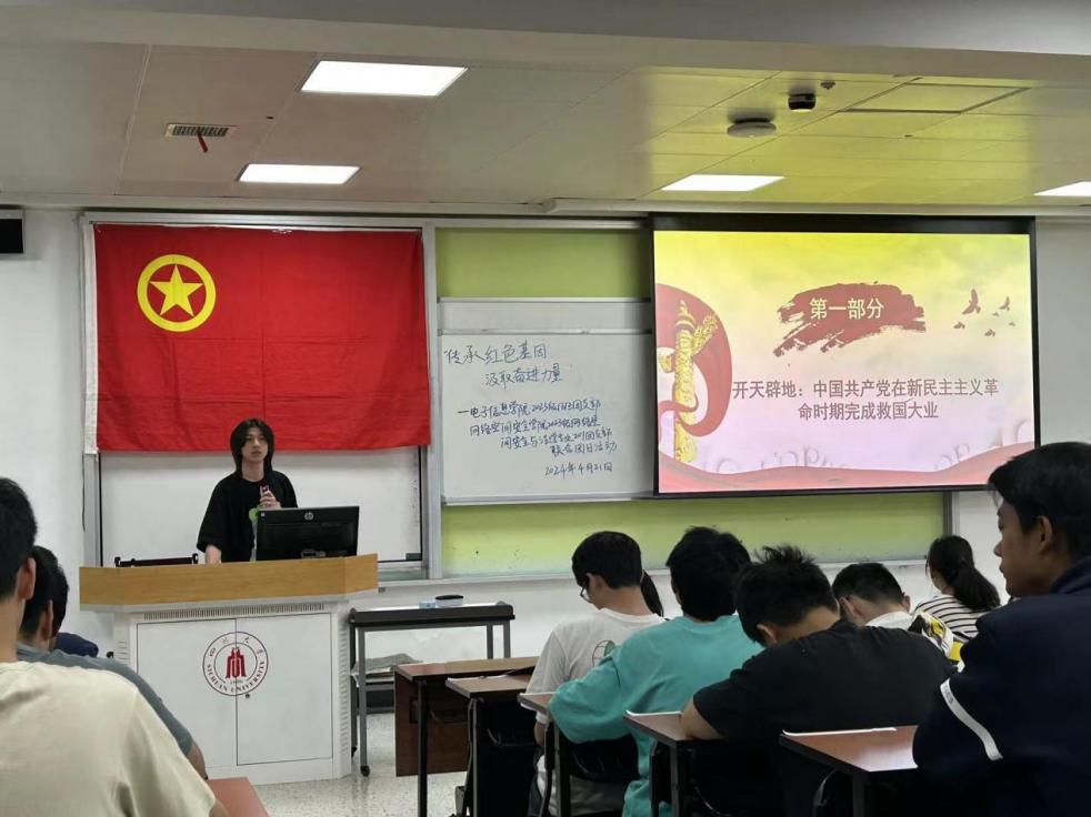 2023级网络空间安全与法学专业201团支部团支书张珈乐带领大家进行红色党史的学习。在学习过程中,团支书张珈乐深情回顾了党的奋斗历史,热情讴歌了党的光辉业绩,激励同学们发扬党的光荣传统和优良作风,激发大家的爱国主义情感。