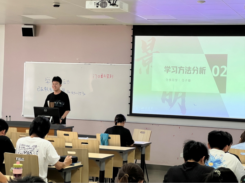 接着,任子琦同学分享了自己在学习方法方面的独特经验,他提出了需要线上线下同步学习的模式,养成查漏补缺以及乐于请教他人的学习习惯,干货满满,得到了同学们良好的反馈。