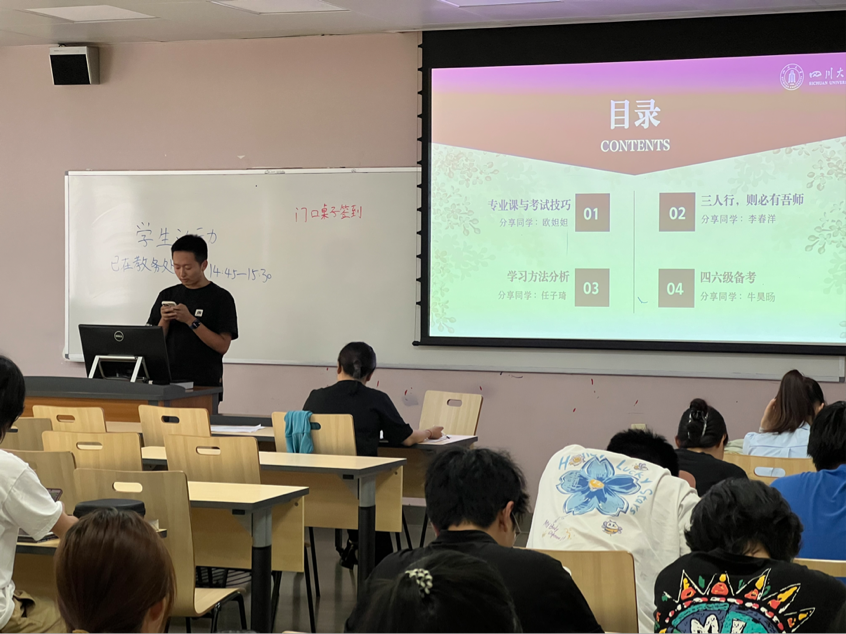 最后,由牛昊旸同学进行四六级备考的经验分享,他首先向大家讲述了四六级试卷的分数构成,并且分析每道题目应该安排的时间是多少,让同学们有一个全局的框架,其次,他着重从几个重点题型向大家分享了解题之道,同学们纷纷表示收获很多。