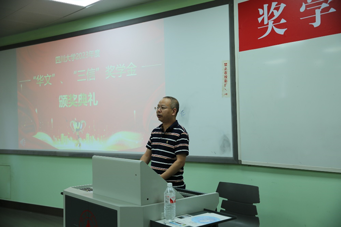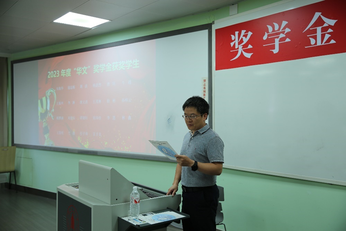 首先全体师生起立合唱中华人民共和国国歌。随后廖勇明副书记介绍了到场嘉宾及领导、卿粼波副院长宣读2023年度“华文”奖学金获奖名单。然后获奖学生代表寇廷栋同学发表获奖感言。寇廷栋同学表示非常荣幸能够获奖,感谢18XXX