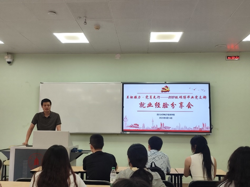2021级硕博毕业生党支部主办的“关怀接力·党员先行” 就业经验分享会在望江校区基A教学楼316顺利举行。此次分享会旨在为研一、研二的同学们提供一个与即将步入职场的师兄师姐面对面交流的平台,通过分享求职过程中的心得与体会,为他们的职业发展之路提供宝贵的指导和建议。
