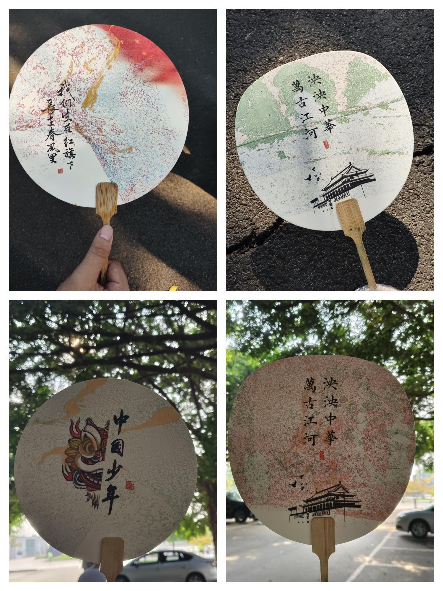 最后,在国庆佳节来临之际,在宣传委员李昕怡带领下,大家用积分兑换到印有国庆主题图案或文字的空白扇子一起体验了传统工艺——漆扇制作。漆扇采用了一种中国特有的、拥有悠久历史的天然涂料——大漆作为漂染材料,这不仅是一种现代创新工艺,也是对传统技艺的巧妙融合。