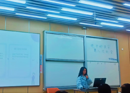 会上,主席团先对本学期的各项工作进行总结。自9月学期伊始顺利开展的招新纳员至年末12月圆满结束的第三次教授茶座会,大大小小的活动在电子科技园次第绽放,为校园增添了几处风景。回顾结束后,主席团的学长又概述了下学期的工作安排,尤其是有关船模设计大赛的相关事宜。其次,各部门分别就自身上个月的工作成果和2025年的工作计划做了报告。一项又一项的成果在大家眼前铺展,让人不由得为之感慨。单丝难为线,孤木不成林,电子科技园的每一项活动都离不开各部门的协力合作,离不开每一位成员的默默付出。例会进行到最后部分,在刚刚结束的电子科技园干事考核中表现优良的二十六位同学,在全体成员的见证下,被授予了来自科技园的表彰,获得“技术之星”称号和印有E-Garden Logo的精美白色马克杯一只。