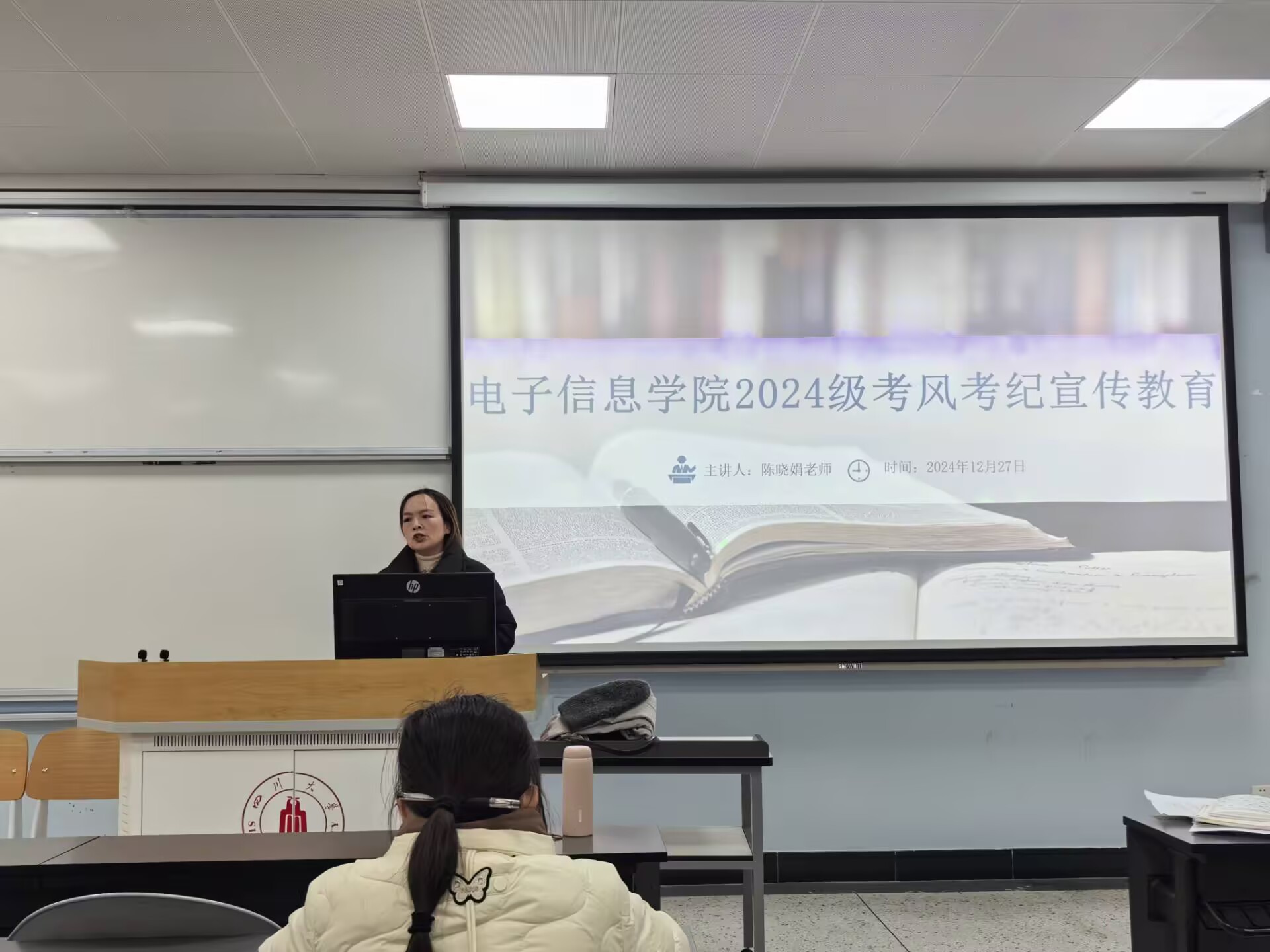 2024级本科新生齐聚江安校区一教B座B407教室,参加了一场别开生面的考风考纪专题教育讲座。本次讲座由辅导员陈晓娟老师倾情主讲,旨在深化新生对诚信考试的认识,筑牢学术诚信的坚固防线。