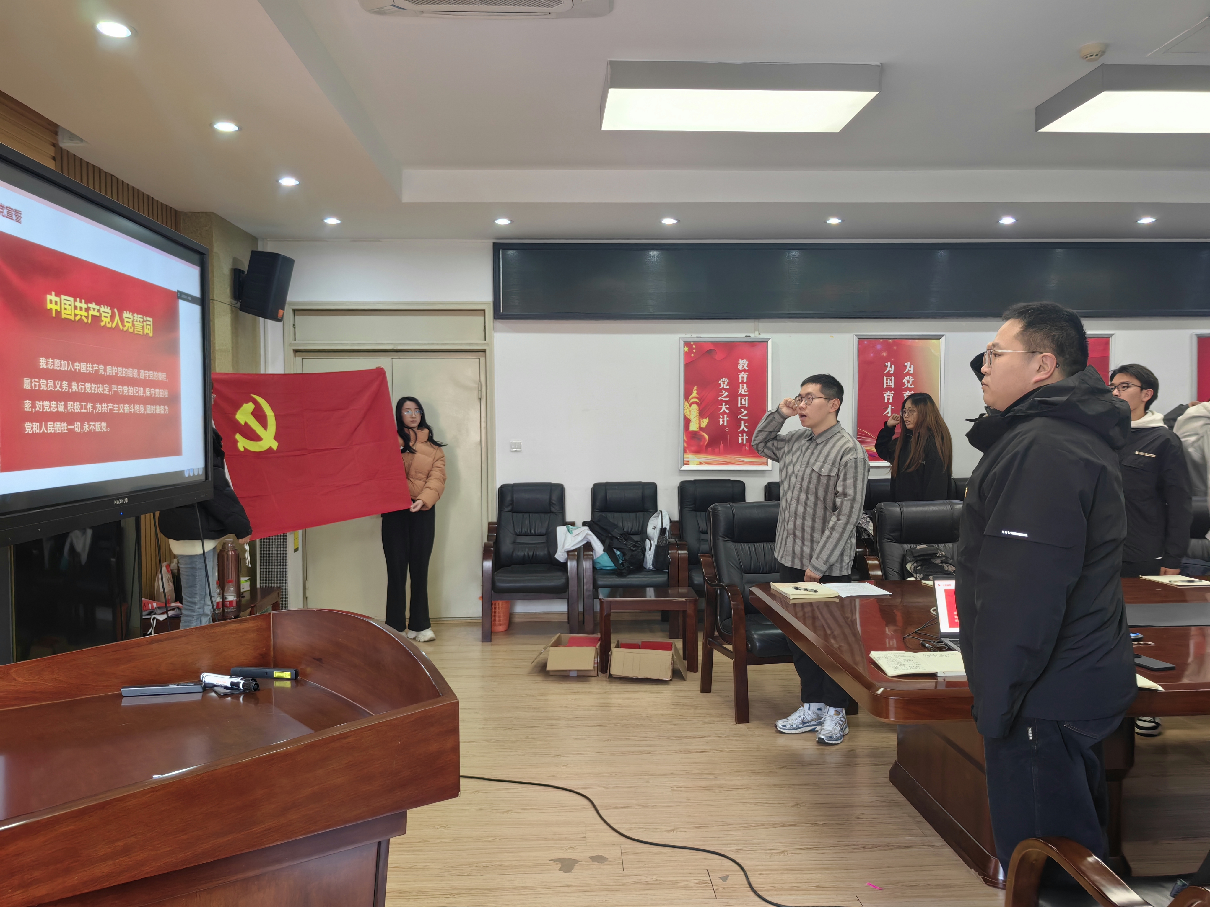 首先,新党员入党仪式在庄严的《国际歌》声中拉开帷幕。全体党员起立,高唱《国际歌》,歌声激昂,传递着共产主义的坚定信念。随后,在支部书记申鑫同志的带领下,全体党员面向党旗,右手握拳,庄重地重温入党誓词。一字一句,铿锵有力,誓言在教室中回荡,强烈地表达出党员们对党的无限忠诚与为党的事业不懈奋斗的决心。