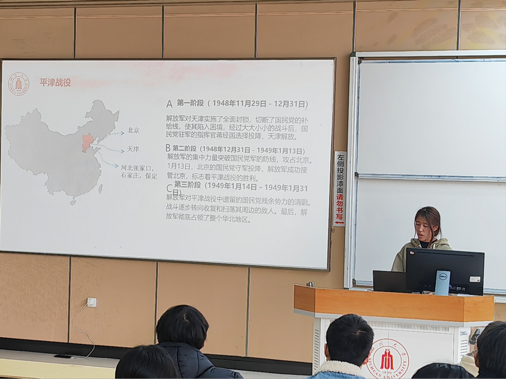 在“红途轮忆,青讲党史”环节,由李继莎小组进行了解放战争时期三大战役的分享。小组成员李继莎、吴娜和蔡宏杰分别讲述了辽沈战役、淮海战役和平津战役的历史背景、关键节点和重要意义。他们通过生动的语言和详实的历史资料,再现了三大战役中解放军战士们的英勇事迹和战略智慧,带领大家重温那段波澜壮阔的革命岁月。