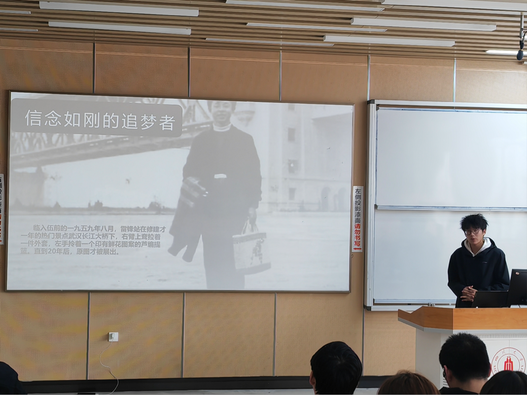 随后,在读书分享环节中,艾宇飞和张义组成的小组带来了书籍《雷锋在营口》的精彩分享。他们从雷锋在营口期间的成长经历出发,结合书中的具体事例,展现了雷锋同志助人为乐、无私奉献的精神品质。通过互动问答的形式,他们引导同学们思考如何在生活中践行雷锋精神,将榜样力量融入日常。